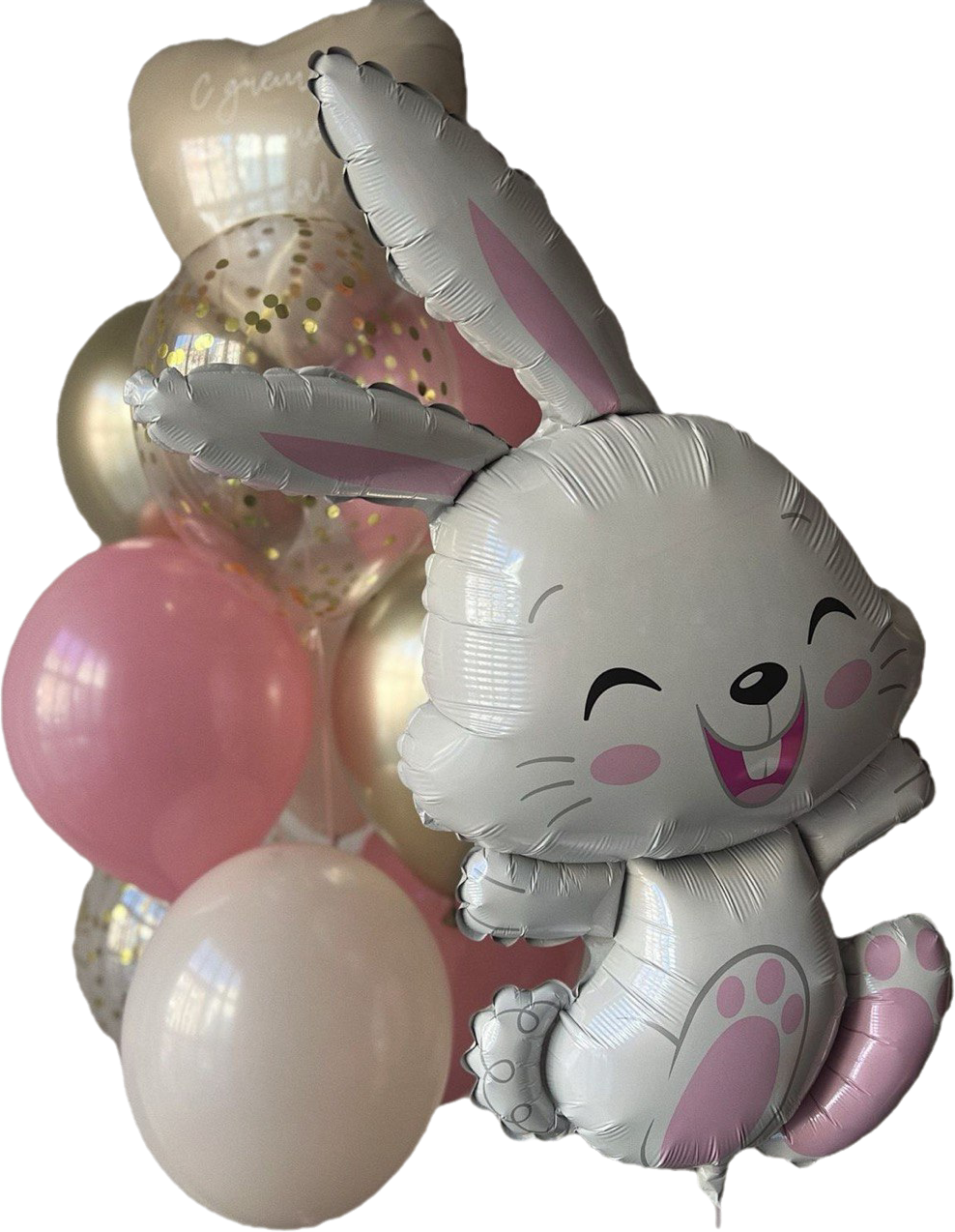 связка из 3 хромированных розовых шаров, 3 прозрачных шаров с конфетти и три латексных шара в технике даблстафф, фольгированная звезда с надписью
